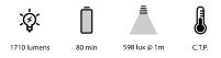 1710 lúmenes con 150º de apertura, sin “hotspot” para conseguir una iluminación de calidad innegable. Potencia constante durante toda la autonomía.